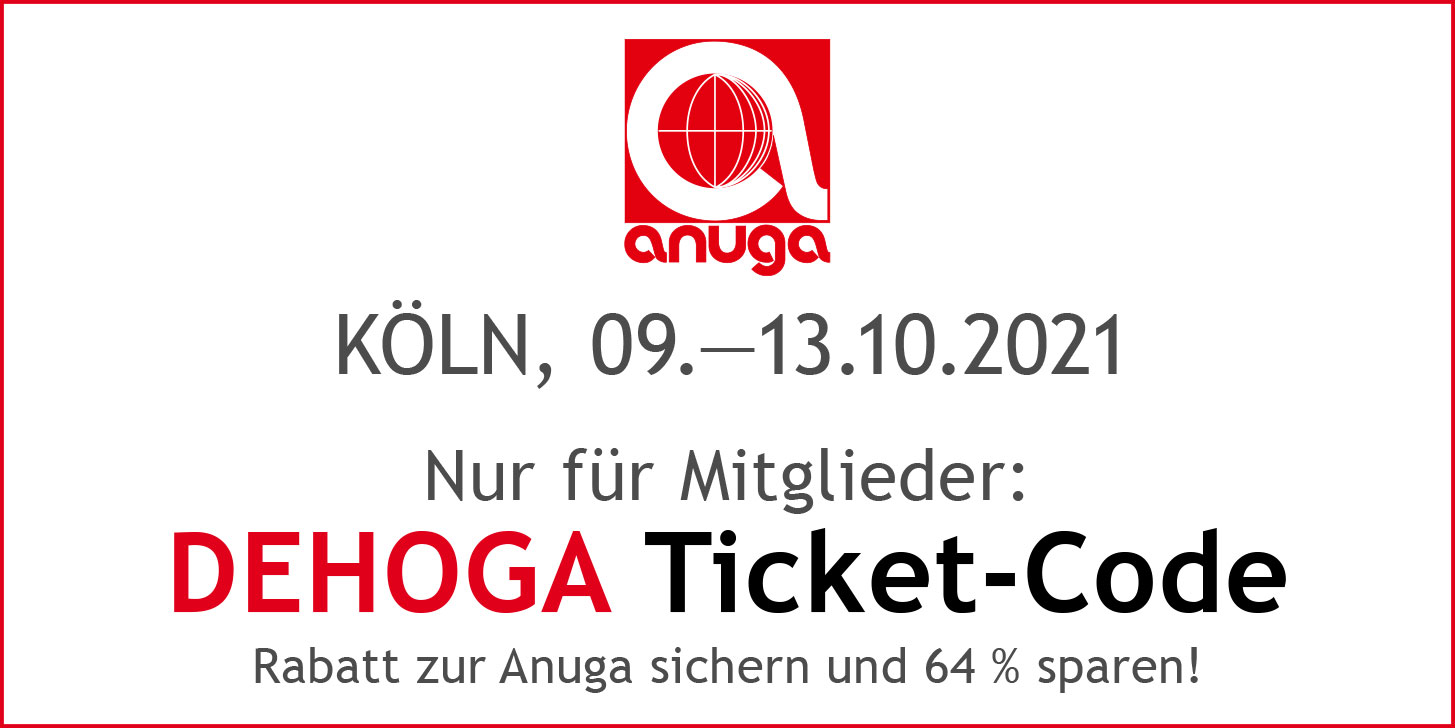 Wie gewohnt können wir unseren Mitgliedern auch in diesem Jahr über unsere Rabattcodes ein attraktives Angebot für den Besuch der Anuga machen. Das Ticket kostet dann nur 18 Euro, bei einem Normalpreis für die Messe von 50 Euro. Ersparnis: 64%. Bestellt werden können die Rabattcodes über den DEHOGA NRW, über die hier verlinkte Seite bzw. Unterseite.